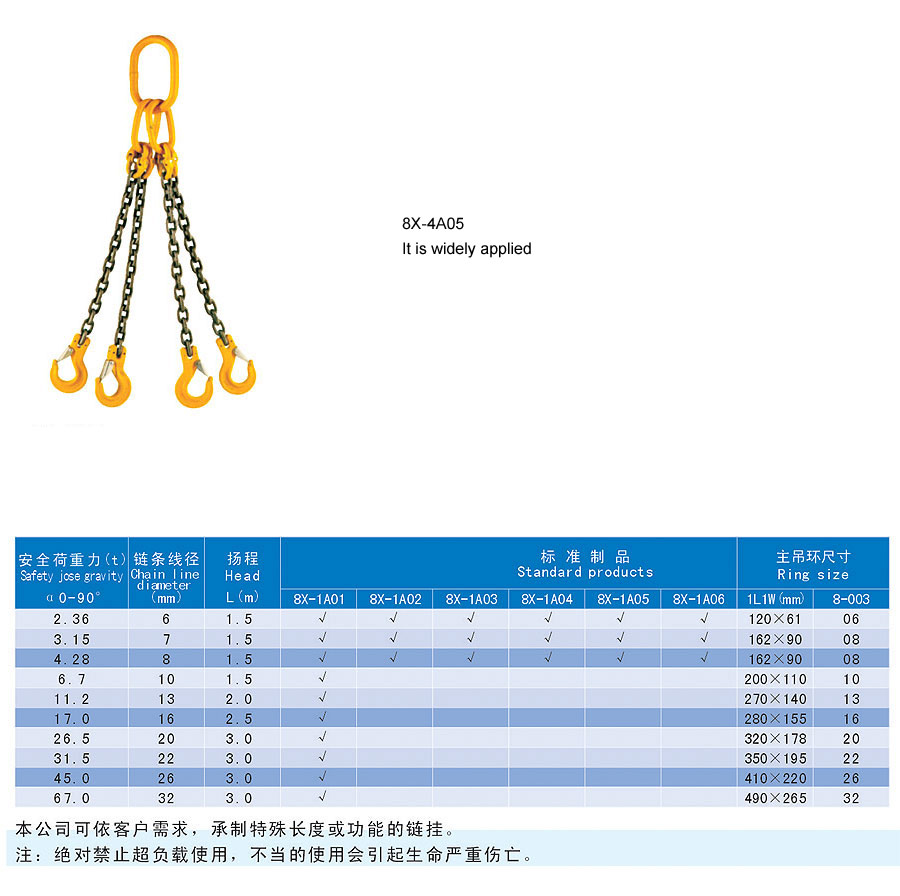 Chain rigging is a kind of rigging formed by connecting metallic chain links, which is divided into two categories in form, namely welding type and assembling type and falls into single foot and multi-feet in structure. The chain rigging is made of high quality alloy steel, boasts wear resistance, high strength, durability and flexibility and is suitable for large scale and frequent usage. Additionally, it is anti-radiation and high temperature(-40~200℃) and is suitable for lifting hot steel billet and steel coil. The flexible multiple feet and various combinations can improve efficiency and cut cost. The company offers general types of ship store, accessories and marine spare supply and technical services and it aims to provide best products and services for our customers.