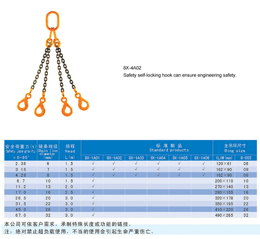 Chain rigging is a kind of rigging formed by connecting metallic chain links, which is divided into two categories in form, namely welding type and assembling type and falls into single foot and multi-feet in structure. The chain rigging is made of high quality alloy steel, boasts wear resistance, high strength, durability and flexibility and is suitable for large scale and frequent usage. Additionally, it is anti-radiation and high temperature(-40~200℃) and is suitable for lifting hot steel billet and steel coil. The flexible multiple feet and various combinations can improve efficiency and cut cost. The company offers general types of ship store, accessories and marine spare supply and technical services and it aims to provide best products and services for our customers.