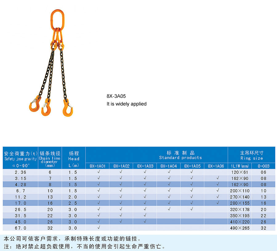 Chain rigging is a kind of rigging formed by connecting metallic chain links, which is divided into two categories in form, namely welding type and assembling type and falls into single foot and multi-feet in structure. The chain rigging is made of high quality alloy steel, boasts wear resistance, high strength, durability and flexibility and is suitable for large scale and frequent usage. Additionally, it is anti-radiation and high temperature(-40~200℃) and is suitable for lifting hot steel billet and steel coil. The flexible multiple feet and various combinations can improve efficiency and cut cost. The company offers general types of ship store, accessories and marine spare supply and technical services and it aims to provide best products and services for our customers.