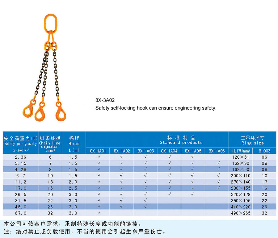 Chain rigging is a kind of rigging formed by connecting metallic chain links, which is divided into two categories in form, namely welding type and assembling type and falls into single foot and multi-feet in structure. The chain rigging is made of high quality alloy steel, boasts wear resistance, high strength, durability and flexibility and is suitable for large scale and frequent usage. Additionally, it is anti-radiation and high temperature(-40~200℃) and is suitable for lifting hot steel billet and steel coil. The flexible multiple feet and various combinations can improve efficiency and cut cost. The company offers general types of ship store, accessories and marine spare supply and technical services and it aims to provide best products and services for our customers.