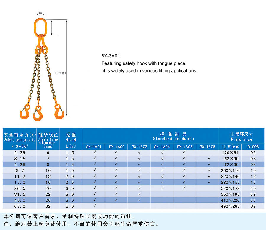 Chain rigging is a kind of rigging formed by connecting metallic chain links, which is divided into two categories in form, namely welding type and assembling type and falls into single foot and multi-feet in structure. The chain rigging is made of high quality alloy steel, boasts wear resistance, high strength, durability and flexibility and is suitable for large scale and frequent usage. Additionally, it is anti-radiation and high temperature(-40~200℃) and is suitable for lifting hot steel billet and steel coil. The flexible multiple feet and various combinations can improve efficiency and cut cost. The company offers general types of ship store, accessories and marine spare supply and technical services and it aims to provide best products and services for our customers.