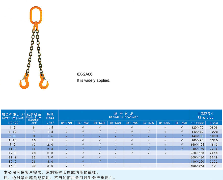 Chain rigging is a kind of rigging formed by connecting metallic chain links, which is divided into two categories in form, namely welding type and assembling type and falls into single foot and multi-feet in structure. The chain rigging is made of high quality alloy steel, boasts wear resistance, high strength, durability and flexibility and is suitable for large scale and frequent usage. Additionally, it is anti-radiation and high temperature(-40~200℃) and is suitable for lifting hot steel billet and steel coil. The flexible multiple feet and various combinations can improve efficiency and cut cost. The company offers general types of ship store, accessories and marine spare supply and technical services and it aims to provide best products and services for our customers.