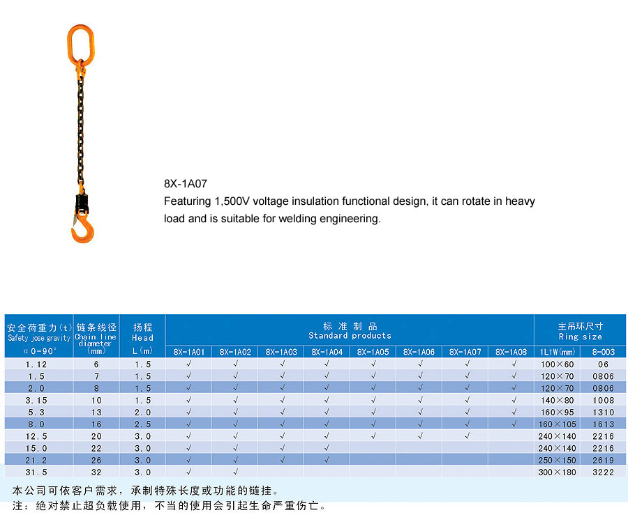 Chain rigging is a kind of rigging formed by connecting metallic chain links, which is divided into two categories in form, namely welding type and assembling type and falls into single foot and multi-feet in structure. The chain rigging is made of high quality alloy steel, boasts wear resistance, high strength, durability and flexibility and is suitable for large scale and frequent usage. Additionally, it is anti-radiation and high temperature(-40~200℃) and is suitable for lifting hot steel billet and steel coil. The flexible multiple feet and various combinations can improve efficiency and cut cost. The company offers general types of ship store, accessories and marine spare supply and technical services and it aims to provide best products and services for our customers.