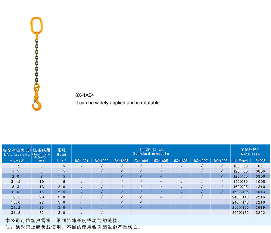 Chain rigging is a kind of rigging formed by connecting metallic chain links, which is divided into two categories in form, namely welding type and assembling type and falls into single foot and multi-feet in structure. The chain rigging is made of high quality alloy steel, boasts wear resistance, high strength, durability and flexibility and is suitable for large scale and frequent usage. Additionally, it is anti-radiation and high temperature(-40~200℃) and is suitable for lifting hot steel billet and steel coil. The flexible multiple feet and various combinations can improve efficiency and cut cost. The company offers general types of ship store, accessories and marine spare supply and technical services and it aims to provide best products and services for our customers.