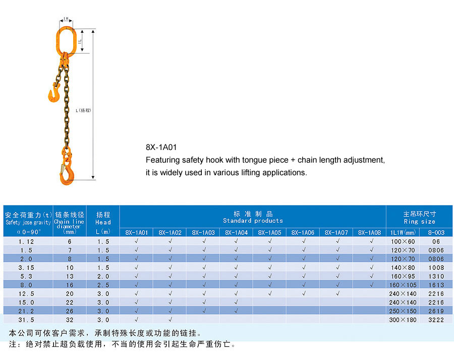 Chain rigging is a kind of rigging formed by connecting metallic chain links, which is divided into two categories in form, namely welding type and assembling type and falls into single foot and multi-feet in structure. The chain rigging is made of high quality alloy steel, boasts wear resistance, high strength, durability and flexibility and is suitable for large scale and frequent usage. Additionally, it is anti-radiation and high temperature(-40~200℃) and is suitable for lifting hot steel billet and steel coil. The flexible multiple feet and various combinations can improve efficiency and cut cost. The company offers general types of ship store, accessories and marine spare supply and technical services and it aims to provide best products and services for our customers.