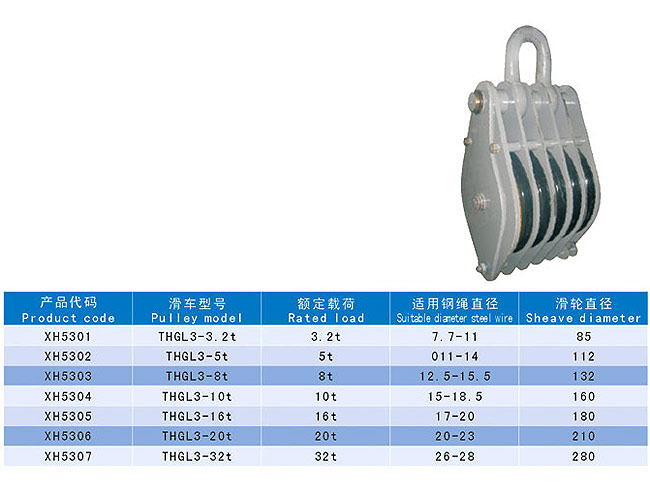 Tackle is divided into single-wheel tackle, double-wheel tackle and multiple –wheel tackle according to wheel number; it is also classified into hook tackle, chain ring tackle, ring tackle and hanging beam tackle according to the connection way between tackle and hanging objects. General speaking, most of small or medium sized tackles fall into hook tackle, chain ring tackle and ring tackle while large sized tackles are usually ring tackle or hanging beam tackle; it is categorized into tackle with sliding bearing mounted between axles and tackle with rolling bearing mounted between axles according to the joint of wheel and axle; it can be divided into opened tackle and closed tackle according to splint. The splint of opened tackle can be opened to facilitate installing cable and most of opened tackles are single wheel tackle which is used as guide tackle at the bottom of standing derrick; it can be divided into fixed tackle and movable tackle according usage way. It is convenient to use tackles which can be widely used in places such as factory, mine, agriculture, electricity power, construction, wharf, dock, machine installation in warehouse and cargo lifting in a manual and mechanical way.