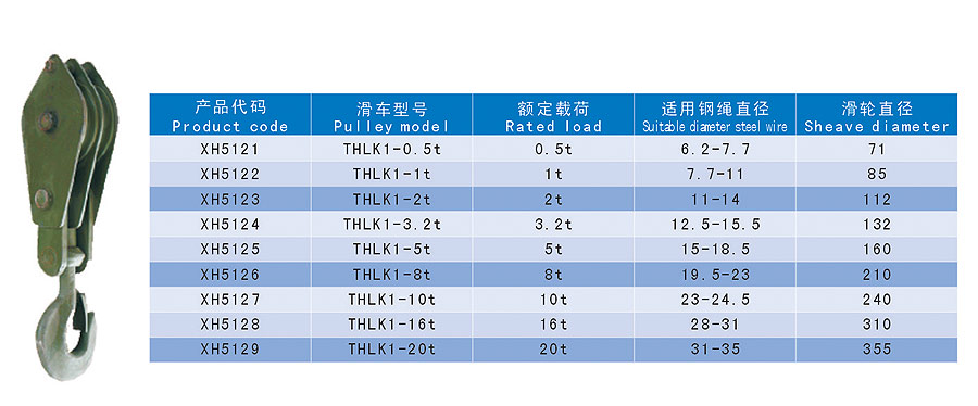 Tackle is divided into single-wheel tackle, double-wheel tackle and multiple –wheel tackle according to wheel number; it is also classified into hook tackle, chain ring tackle, ring tackle and hanging beam tackle according to the connection way between tackle and hanging objects. General speaking, most of small or medium sized tackles fall into hook tackle, chain ring tackle and ring tackle while large sized tackles are usually ring tackle or hanging beam tackle; it is categorized into tackle with sliding bearing mounted between axles and tackle with rolling bearing mounted between axles according to the joint of wheel and axle; it can be divided into opened tackle and closed tackle according to splint. The splint of opened tackle can be opened to facilitate installing cable and most of opened tackles are single wheel tackle which is used as guide tackle at the bottom of standing derrick; it can be divided into fixed tackle and movable tackle according usage way. It is convenient to use tackles which can be widely used in places such as factory, mine, agriculture, electricity power, construction, wharf, dock, machine installation in warehouse and cargo lifting in a manual and mechanical way.