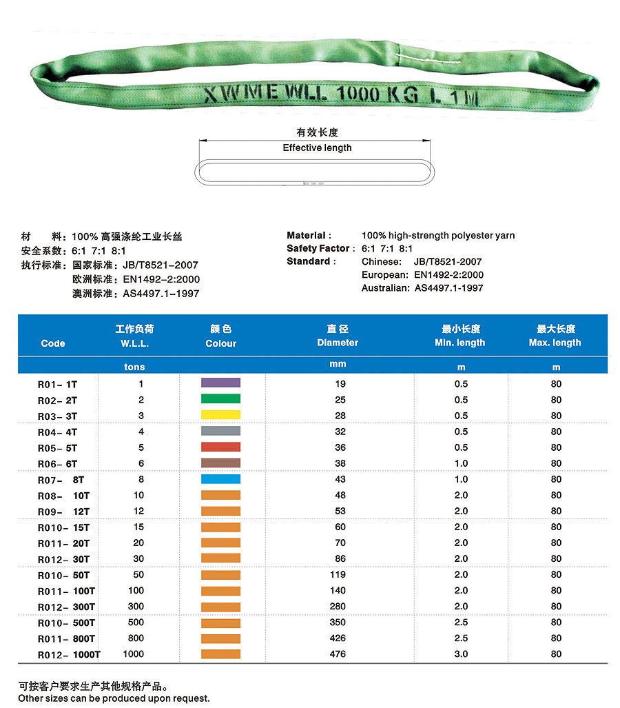 合成纖維吊裝帶(以下簡稱吊裝帶)為軟吊裝帶,采用非金屬原料,屬吊裝行業(yè)中鋼繩、鏈條的換代產(chǎn)品,比同類金屬繩相對輕便。能解決實(shí)際吊裝過程中大噸位、小吊裝空間的吊裝難題。吊裝帶有輕便、使用壽命長、減震性能好、不導(dǎo)電、不易腐蝕、保護(hù)被吊物品不被刮傷等特點(diǎn)。多次的斷裂試驗(yàn)表明,吊裝帶相對于金屬繩鏈產(chǎn)生的反向傷害幾乎為零。吊裝帶采用國際標(biāo)準(zhǔn)色來區(qū)分承載噸位,在使用過程中,吊帶裝上的標(biāo)簽?zāi)p后,可能過吊裝帶外套的顏色來識別承重重量。合成纖維吊裝帶在國際上起步較早,至今已有著五十多年的應(yīng)用歷史,在經(jīng)過二十多年的國內(nèi)推廣應(yīng)用,以其獨(dú)有的顯著優(yōu)勢,早許多行業(yè)正逐步替代鋼絲繩索具和鏈條索具。