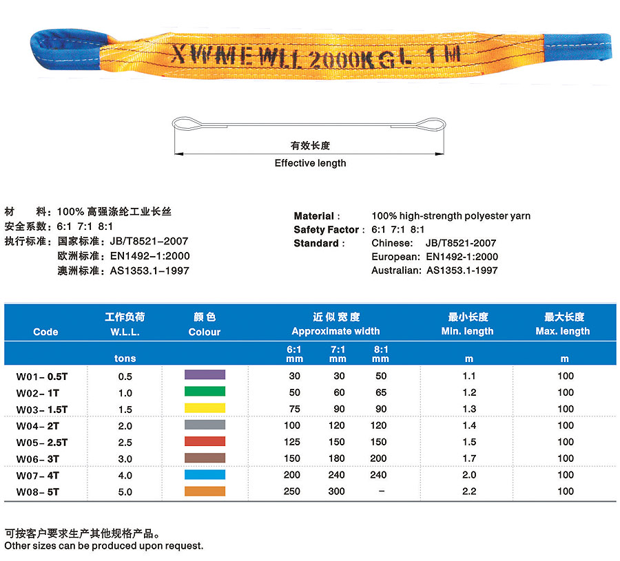 合成纖維吊裝帶(以下簡稱吊裝帶)為軟吊裝帶,采用非金屬原料,屬吊裝行業(yè)中鋼繩、鏈條的換代產(chǎn)品,比同類金屬繩相對輕便。能解決實(shí)際吊裝過程中大噸位、小吊裝空間的吊裝難題。吊裝帶有輕便、使用壽命長、減震性能好、不導(dǎo)電、不易腐蝕、保護(hù)被吊物品不被刮傷等特點(diǎn)。多次的斷裂試驗表明,吊裝帶相對于金屬繩鏈產(chǎn)生的反向傷害幾乎為零。吊裝帶采用國際標(biāo)準(zhǔn)色來區(qū)分承載噸位,在使用過程中,吊帶裝上的標(biāo)簽?zāi)p后,可能過吊裝帶外套的顏色來識別承重重量。合成纖維吊裝帶在國際上起步較早,至今已有著五十多年的應(yīng)用歷史,在經(jīng)過二十多年的國內(nèi)推廣應(yīng)用,以其獨(dú)有的顯著優(yōu)勢,早許多行業(yè)正逐步替代鋼絲繩索具和鏈條索具。