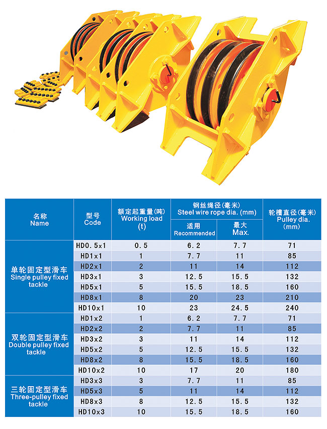 滑車按輪數(shù)的多少分為單門滑車,雙門滑車和多門滑車。按滑車與吊物的連接方式可分為吊鉤式滑車,鏈環(huán)式滑車,吊環(huán)式滑車和吊架式滑車四種。一般中小型的滑車多司于吊鉤式、鏈環(huán)式和吊環(huán)式,而大型滑車采用吊環(huán)式和吊梁式。按輪和軸的接觸不同可分為輪軸間裝滑動軸承及滾動軸承兩種。按夾板是否可以打開來分,有開口滑車和閉口滑車。開口滑車的夾板是可以打開的,便于裝繩索,一般的都是單門滑車,它常用于扒桿底腳處作導(dǎo)向滑車用?;嚢词褂玫姆绞讲煌址譃槎ɑ嚭蛣踊?。使用方便,用途廣泛,可以手動,機(jī)動。主要用于工廠、礦山、農(nóng)業(yè)、電力、建筑的生產(chǎn)施工,碼頭、船塢、倉庫的機(jī)器安裝,貨物起吊等。