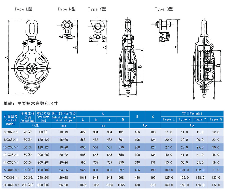 滑車按輪數(shù)的多少分為單門滑車,雙門滑車和多門滑車。按滑車與吊物的連接方式可分為吊鉤式滑車,鏈環(huán)式滑車,吊環(huán)式滑車和吊架式滑車四種。一般中小型的滑車多司于吊鉤式、鏈環(huán)式和吊環(huán)式,而大型滑車采用吊環(huán)式和吊梁式。按輪和軸的接觸不同可分為輪軸間裝滑動軸承及滾動軸承兩種。按夾板是否可以打開來分,有開口滑車和閉口滑車。開口滑車的夾板是可以打開的,便于裝繩索,一般的都是單門滑車,它常用于扒桿底腳處作導向滑車用?;嚢词褂玫姆绞讲煌址譃槎ɑ嚭蛣踊?。使用方便,用途廣泛,可以手動,機動。主要用于工廠、礦山、農業(yè)、電力、建筑的生產施工,碼頭、船塢、倉庫的機器安裝,貨物起吊等。
