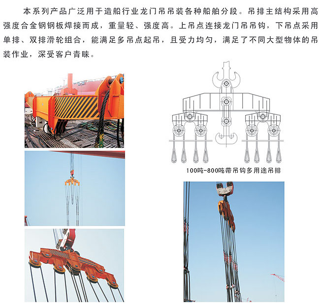本系列產(chǎn)品廣泛用于造船行業(yè)龍門吊吊裝各種船舶分段。吊排主結(jié)構(gòu)采用高強度合金鋼鋼板焊接而成,重量輕、強度高。上吊點連接龍門吊吊鉤,下吊點采用單排、雙排滑輪組合,能滿足多吊點起吊,且受力均勻,滿足了不同大型物體的吊裝作業(yè),深受客戶青睞。